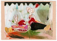 She is occupied with the ways in which invisible forms of self organisation are working within certain systems. And how they attach themselves each time to the systems own logic. Interior, if not domestic spaces often serve as settings for her drawings and collages, from which dream-like futuristic enactments between human and machine-like forms unfold. In the nineties, hand-made paper works gave way to computer graphics, while text has always featured alongside images, underlining the message of Van Kerckhoven's proud, sometimes exhibitionist female figures, like song-lyrics. Music plays an important role in her creative production in parallel to her visual output, and she and Danny Devos have stood as a key pair of the Antwerp experimental music scene under the band name Club Moral (1981-now).