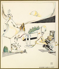 She is occupied with the ways in which invisible forms of self organisation are working within certain systems. And how they attach themselves each time to the systems own logic. Interior, if not domestic spaces often serve as settings for her drawings and collages, from which dream-like futuristic enactments between human and machine-like forms unfold. In the nineties, hand-made paper works gave way to computer graphics, while text has always featured alongside images, underlining the message of Van Kerckhoven's proud, sometimes exhibitionist female figures, like song-lyrics. Music plays an important role in her creative production in parallel to her visual output, and she and Danny Devos have stood as a key pair of the Antwerp experimental music scene under the band name Club Moral (1981-now).