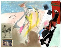 She is occupied with the ways in which invisible forms of self organisation are working within certain systems. And how they attach themselves each time to the systems own logic. Interior, if not domestic spaces often serve as settings for her drawings and collages, from which dream-like futuristic enactments between human and machine-like forms unfold. In the nineties, hand-made paper works gave way to computer graphics, while text has always featured alongside images, underlining the message of Van Kerckhoven's proud, sometimes exhibitionist female figures, like song-lyrics. Music plays an important role in her creative production in parallel to her visual output, and she and Danny Devos have stood as a key pair of the Antwerp experimental music scene under the band name Club Moral (1981-now).